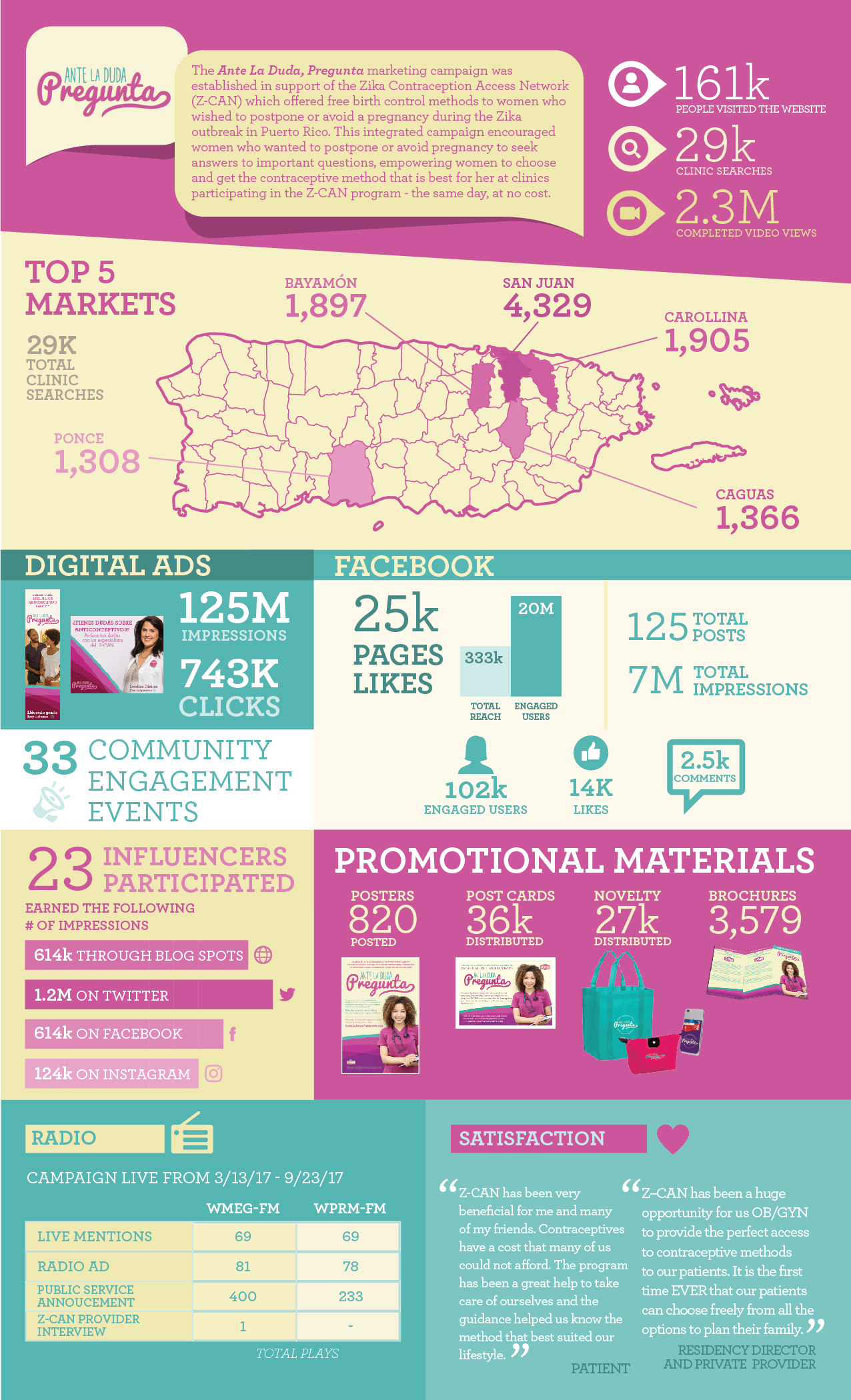 The Ante La Duda, Pregunta health communications campaign was established in support of the Zika Contraception Access Network (Z-CAN), which offered free birth control methods to women who wished to postpone or avoid a pregnancy during the Zika outbreak in Puerto Rico.