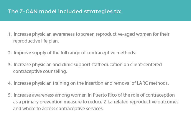 - Increase awareness among women in Puerto Rico of the role of contraception as a primary prevention measure to reduce Zika-related reproductive outcomes and where to access contraceptive services.